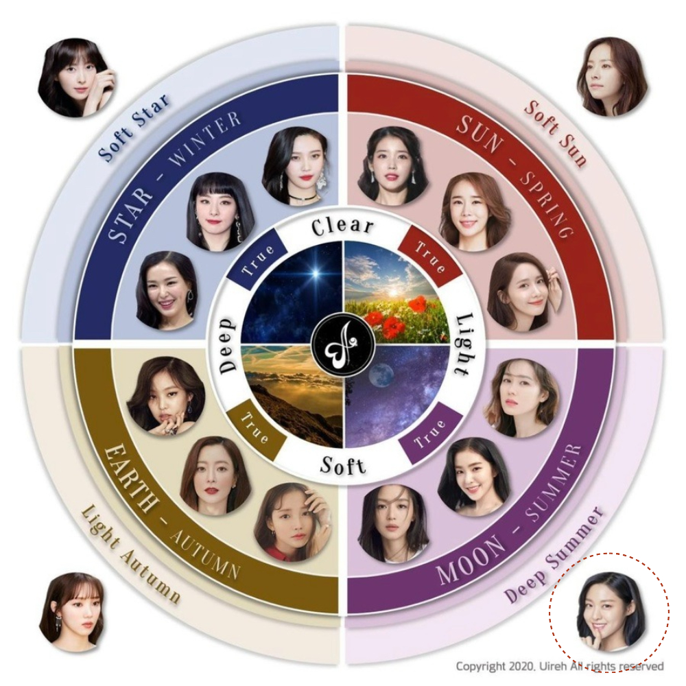 여름 타입 중에서 가장 화려하다고 판단되는 여름 딥 타입. 피부색만으로 판단하기에는 조금 무리가 있지만 여름 타입 중에서는 비교적 까무잡잡한 피부를 가진 사람들이 많고, 볼드한 악세서리와 딥한 색감이 잘 어울려 우아하고 화려한 분위기를 내는 타입인 듯 하다. 딥한 색상들을 보통의 여름 타입보다 잘 소화하기 때문에 주변에서 흔하게 볼 수 있는 타입은 아닌 듯.