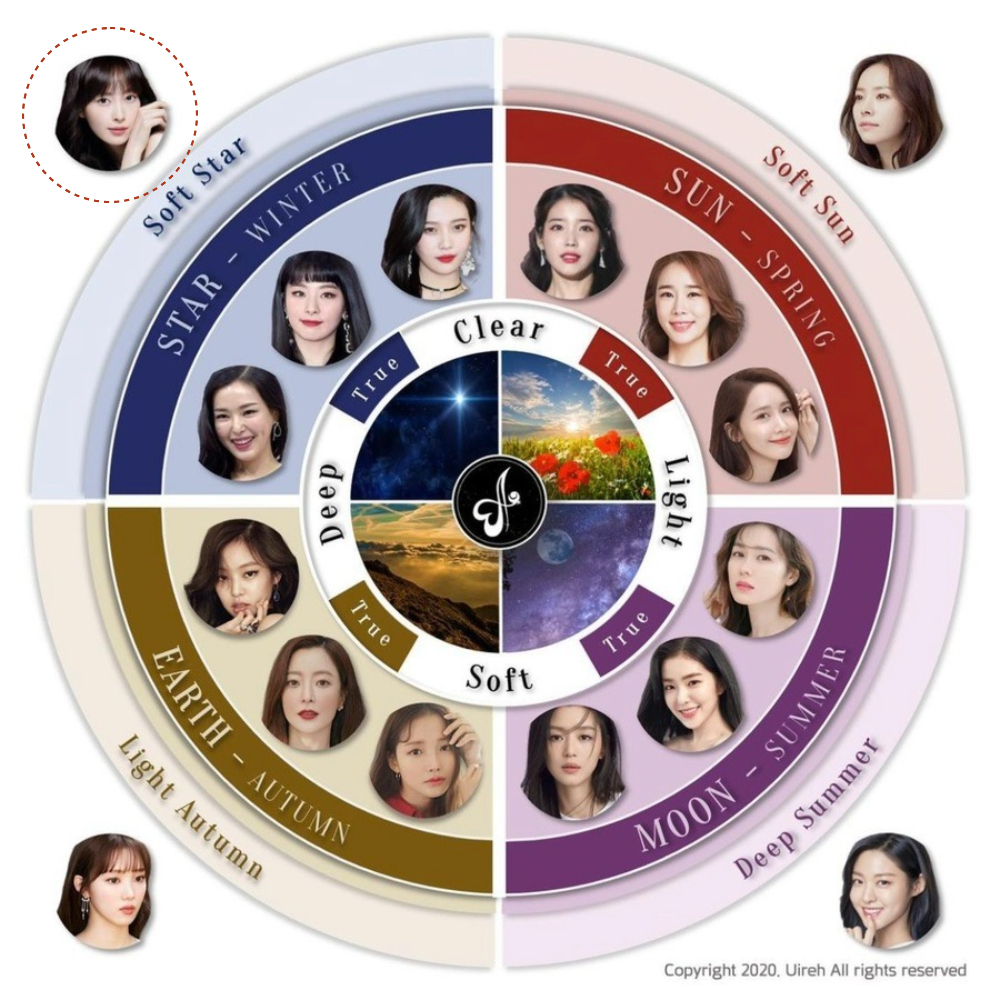 유이레 컬러에서 분류한 셀럽 퍼스널컬러(이나영, 이동욱이 겨울 소프트에 해당)